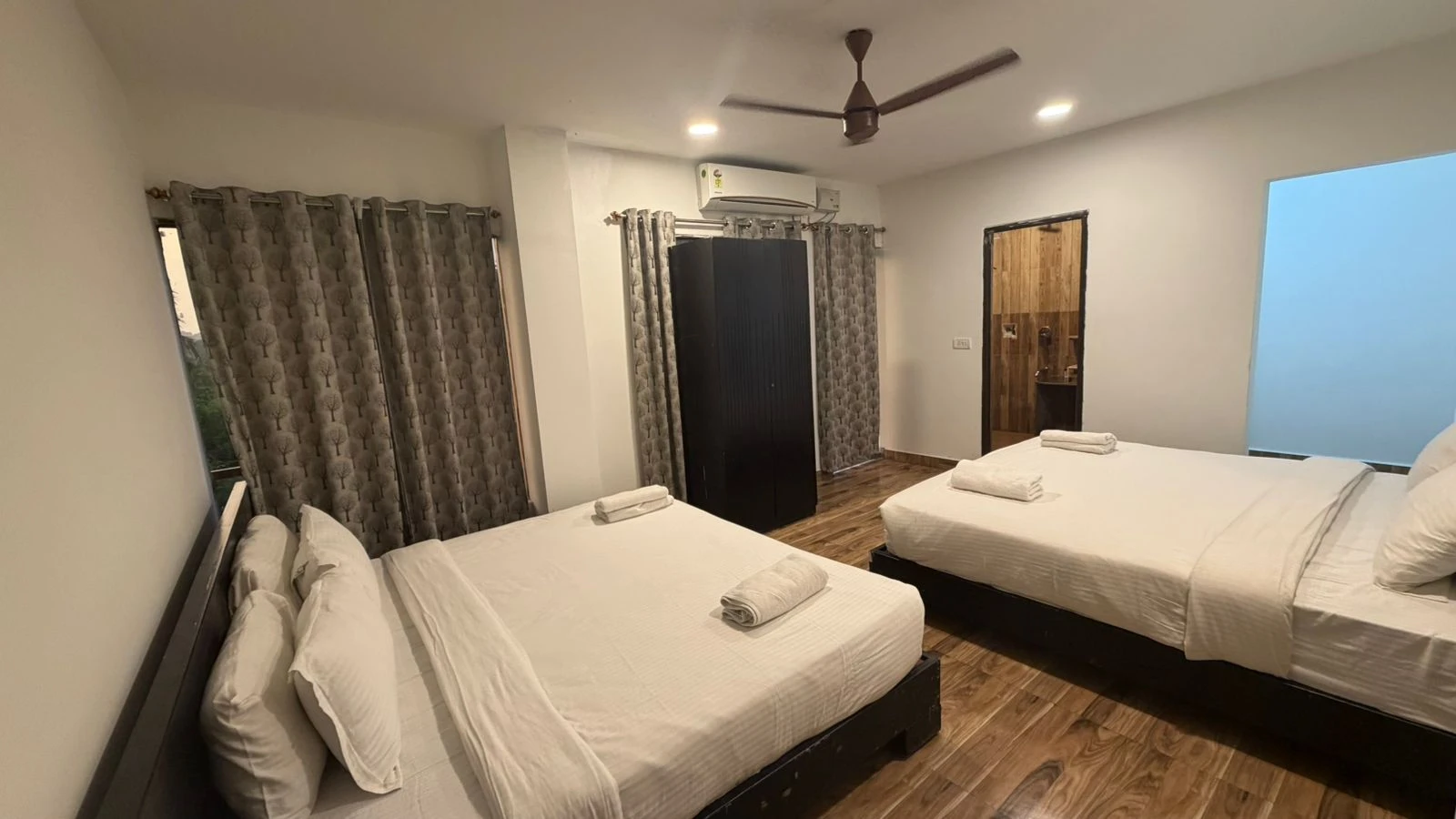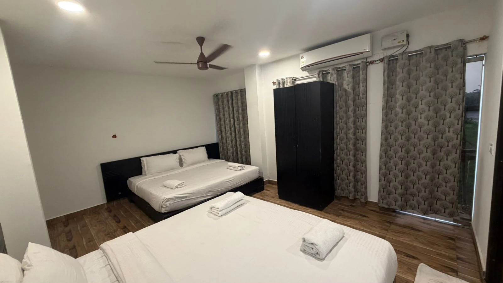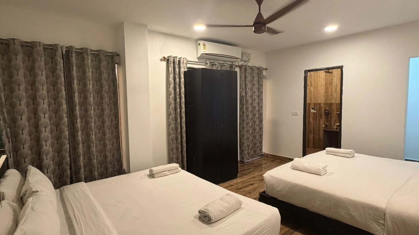 Air-conditioned and non-air-conditioned rooms for four friends or students, featuring comfortable beds, spacious layout.