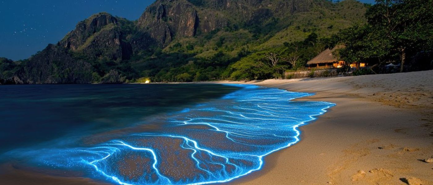 Bioluminescence is the light production of microscopic organisms in the form of a chemical process. As the water is stirred, through paddling, motion, or waves, it forms streaks of blue glow, which make the water appear to have stars floating in it.